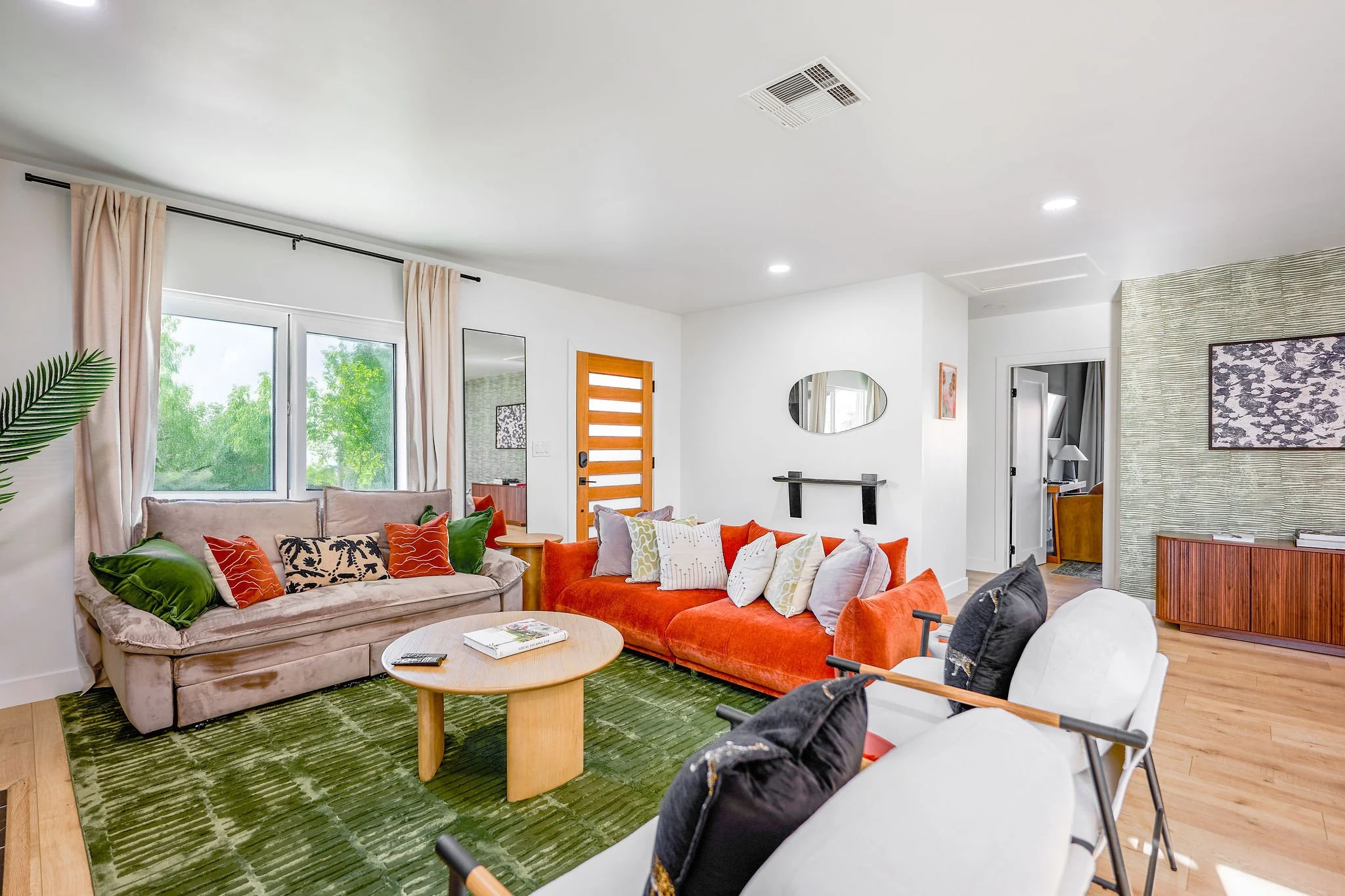 Tucked just beyond the pool, the ADU offers a quiet retreat within the retreat. Complete with its own full kitchen, private bathroom, and a pull-out queen bed that turns the space into a serene guest suite or a cozy lounge between dips in the water. Morning coffee feels different here, with sunlight spilling through the windows and the sound of palm leaves swaying just outside.
