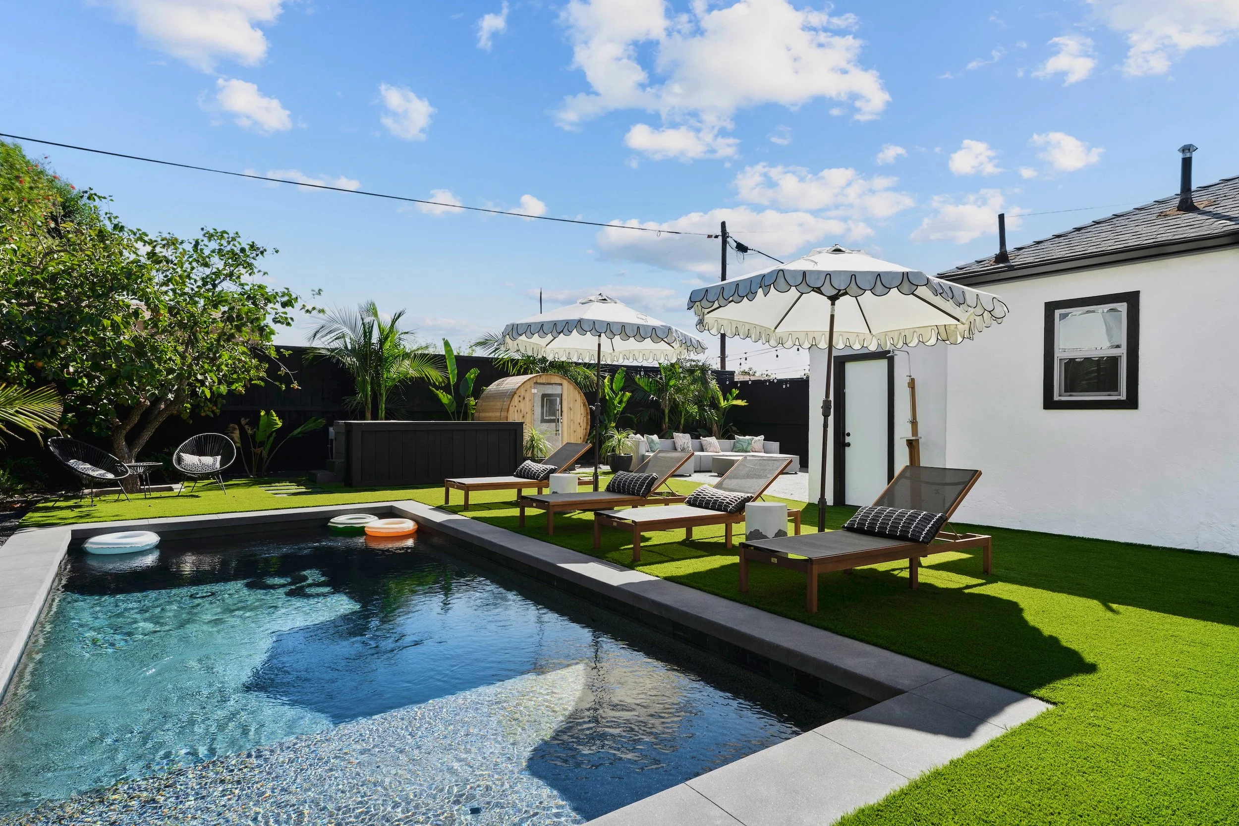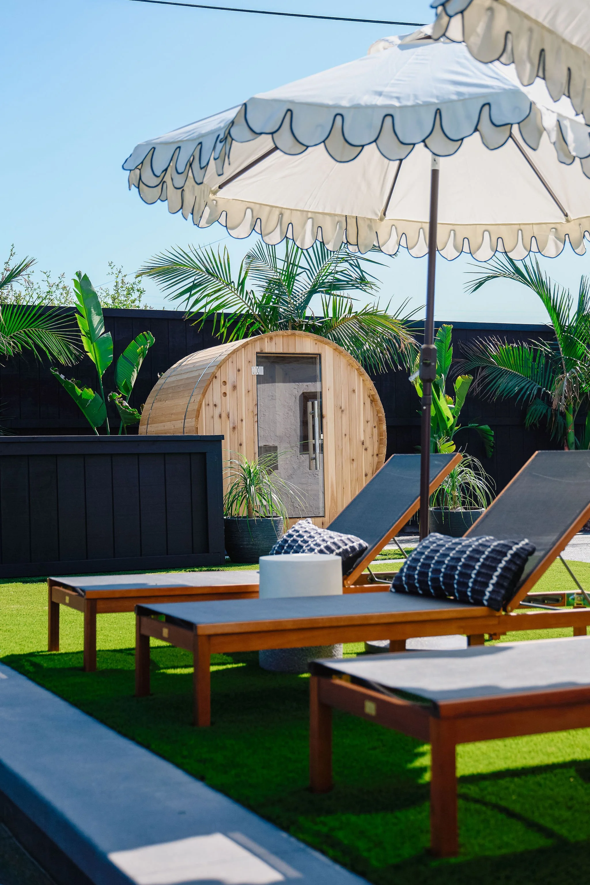 Every corner of Lyon’s Den is thoughtfully composed, layered with warm textures, curated décor, and sun-drenched spaces that feel like a dream you get to live in. The backyard unfolds like a private resort: a sparkling pool framed by beautiful landscaping, a wood-fired sauna, and a bubbling hot tub waiting beneath the stars.